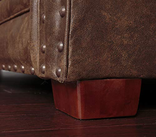 The buckskin collection from American Furniture Classics features a beautiful leather-look microfiber fabric with rustic antique brass nailhead accents. Solid wood frames and legs create a product that will last for years, and the padded arms and a traditional look lend this set a masculine elegance. The fiber-wrapped high density foam cushions offer a soft but supportive seating experience.