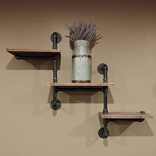 Industrial Bookshelf Pipe Shelves 3 Tiers,Rustic Wood Shelf Wall Mounted,Metal Corner Hung Bracket Shelving Floating…