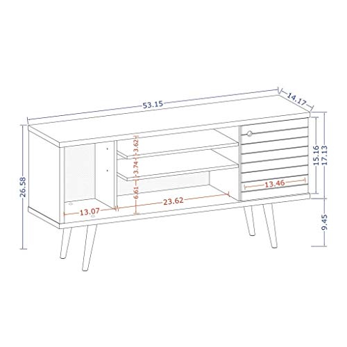 Set a cozy and beautiful stage for the next big game or a movie marathon party with the Liberty TV stand from Manhattan Comfort. Featuring a sleek top with splayed legs, this living room essential brings mid-century modern style to your interior. Attractive as well as practical, this TV stand makes organizing a breeze with its five open shelves and one concealed cubby. Assembly Required